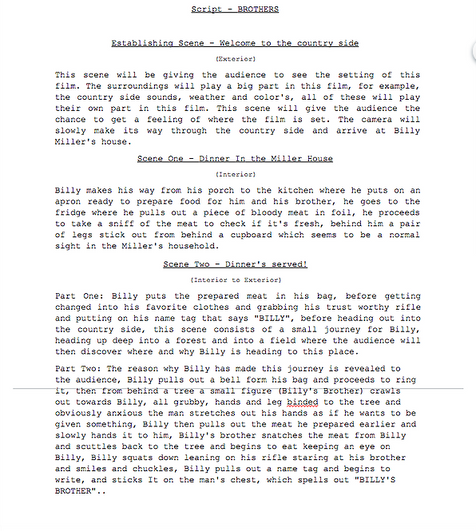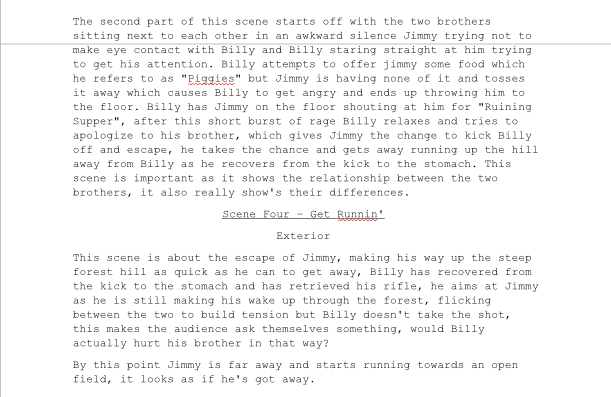 Good cinematography is very important to me, and I think it was a big factor in my film, I really wanted to capture the raw countryside and gritty relationship between my two character through multiple shot types, I think that good cinematography can have a massive impact on how the narrative is told and how you want the audience feels. In my film I wanted my audience to really feel the awkward tension between the two brothers and from recent feedback I think I captured that quite well. The scenery in my film was also a big thing for me, I really wanted my audience to see how isolated these two characters are surrounded by miles of rural land this all plays into my research on 'The Revenant' I really wanted the same natural feeling that 'The Revenant' has, the way the wild surroundings come into play and effect the way people are. I really wanted the environment to have an impact on my characters as it did in the 'The Revenant'. I think that overall I am happy with the cinematography of my film but I would have liked to get so many more shots, due to the lack of time I had with my actors I was unable to capture all the shots I wanted, I think that I would have liked to have another scene in my film to give a better understanding to my audience about the relationship of the two brothers.
