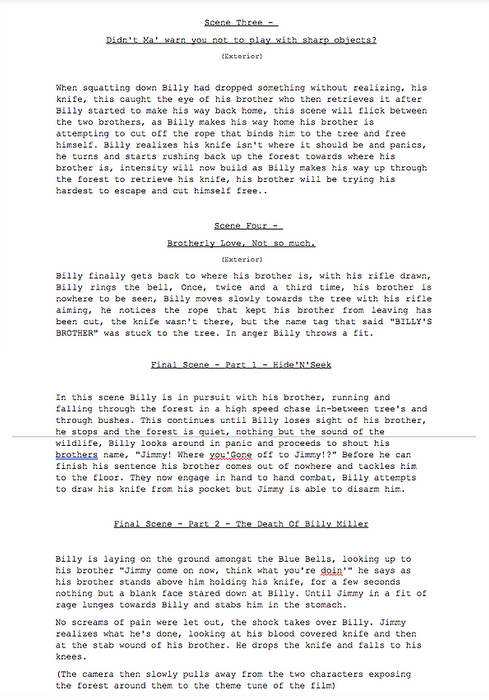 Development: When It comes to casting again in the future I will give people further notice so that they have for time to prepare for a role this will also give me more time to think about who fits into the role of my characters. I would also try and incorporate a script with heavier dialogue for a new challenge.